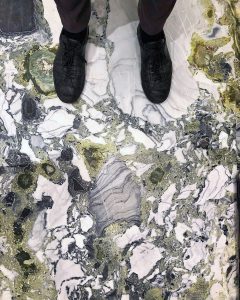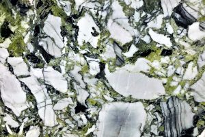 A natural white green marble from China is called White Beauty Marble. a light background Emerald green surrounds with block designs made of gray and black.