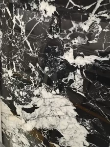 Color: Calacatta Black Marble uses deep black as the main color, showing a rich and even black background overall. On the black background, bright, white marble textures are distributed, forming a sharp contrast.