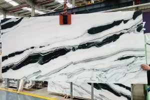 Panda white marble slab frequently has veining in various tones of black and gray, with a base color that is normally white or off-white. The veins can contrast sharply with the lighter background, ranging from subtle and delicate to dramatic and aggressive.